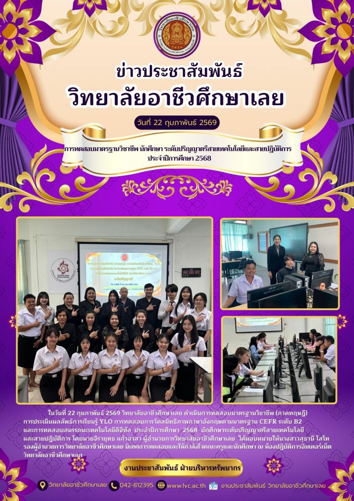 ในวันที่ 22 กุมภาพันธ์ 2569 วิทยาลัยอาชีวศึกษาเลย ดำเนินการทดสอบมาตรฐานวิชาชีพ (ภาคทฤษฎี)การประเมินผลลัพธ์การเรียนรู้ Ylo การทดสอบการวัดสมิทธิภาพภาษาอังกฤษตามมาตรฐาน CEFR ระดับ B2 และการทดสอบสมรรถนะเทคโนโลยีดิจิทัล ประจำปีการศึกษา 2568 นักศึกษาระดับปริญญาตรีสายเทคโนโลยีและสายปฎิบัติการ โดยนายจิรายุทธ แก้วอาสา ผู้อำนวยการวิทยาลัยอาชีวศึกษาเลย ได้มอบหมายให้นางสาวสุธานี โสโท รองผู้อำนวยการวิทยาลัยอาชีวศึกษาเลย นิเทศการทดสอบและให้กำลังใจคณะครูและนักศึกษา ณ ห้องปฎิบัติการอินเตอร์เน็ต วิทยาลัยอาชีวศึกษาเลย