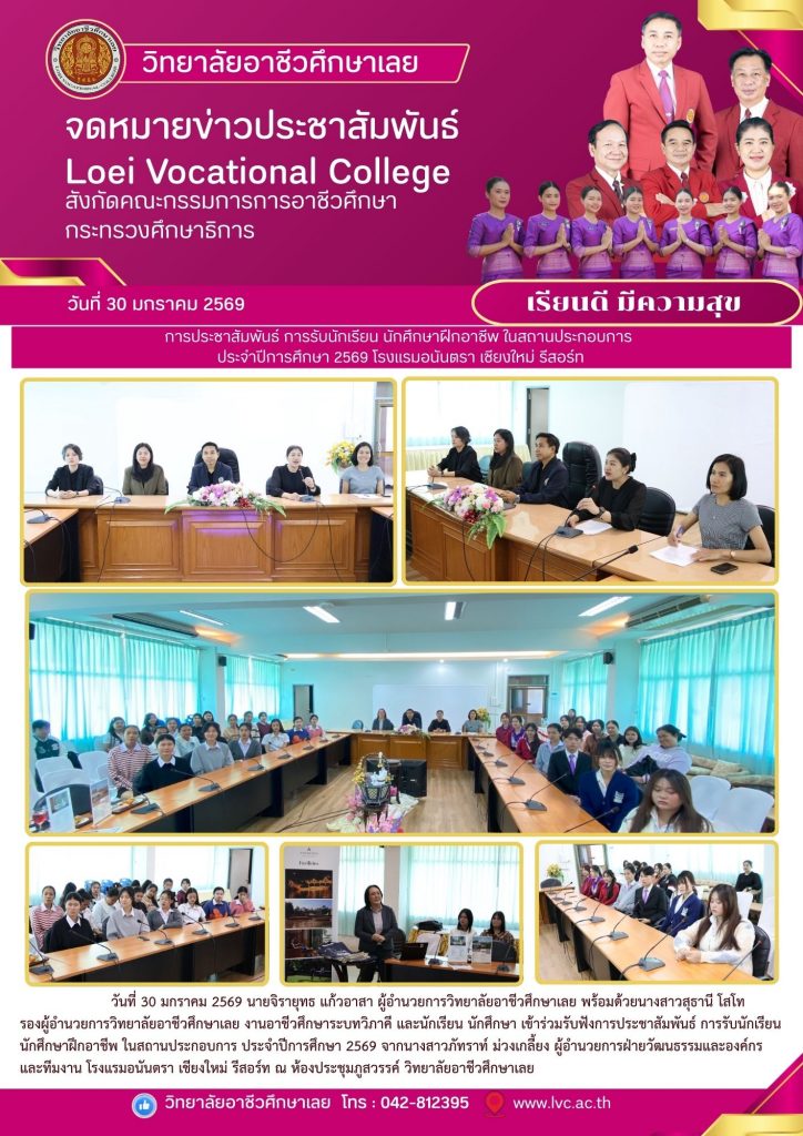 วันที่ 30 มกราคม 2569 นายจิรายุทธ แก้วอาสา ผู้อำนวยการวิทยาลัยอาชีวศึกษาเลย พร้อมด้วยนางสาวสุธานี โสโทรองผู้อำนวยการวิทยาลัยอาชีวศึกษาเลย งานอาชีวศึกษาระบทวิภาคี และนักเรียน นักศึกษา เข้าร่วมรับฟังการประชาสัมพันธ์ การรับนักเรียน นักศึกษาฝึกอาชีพ ในสถานประกอบการ ประจำปีการศึกษา 2569 จากนางสาวภัทราท์ ม่วงเกลี้่ยง ผู้อำนวยการฝ่ายวัฒนธรรมและองค์กรและทีมงาน โรงแรมอนันตรา เชียงใหม่ รีสอร์ท ณ ห้องประชุมภูสวรรค์ วิทยาลัยอาชีวศึกษาเลย