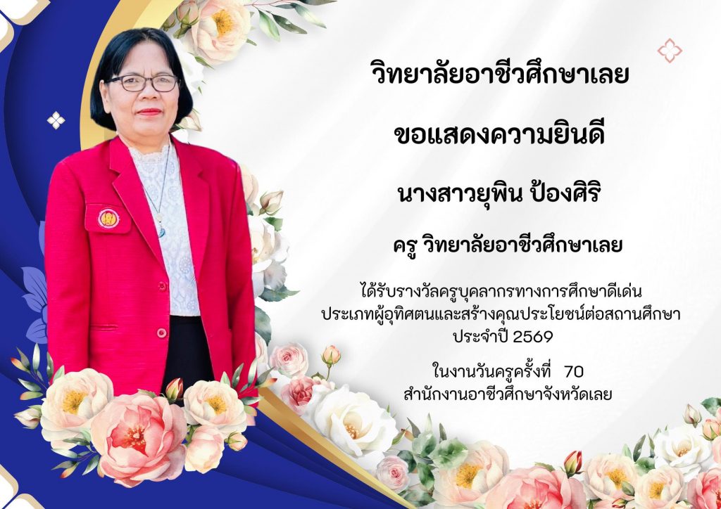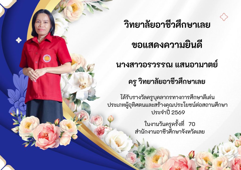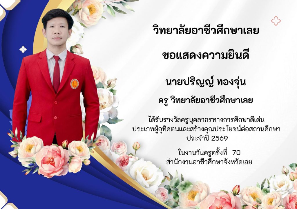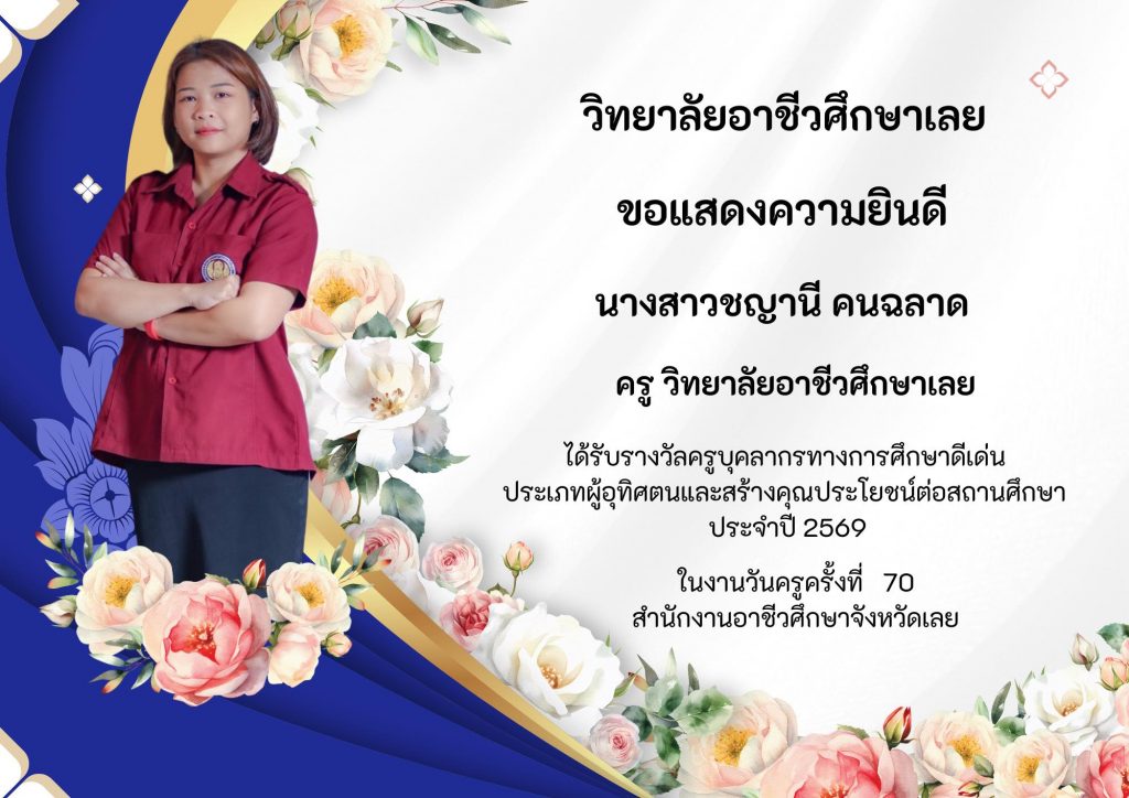 วิทยาลัยอาชีวศึกษาเลยขอแสดงความยินดีกับครูและบุคลากรที่ได้รับรางวัล ประเภทผู้อุทิศตนและสร้างคุณประโยชน์ต่อสถานศึกษา ประจำปี 2569 ในงานวันครูครั้งที่ 70 สำนักงานอาชีวศึกษาจังหวัดเลย