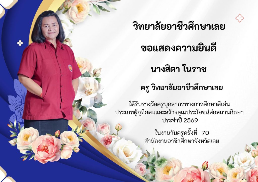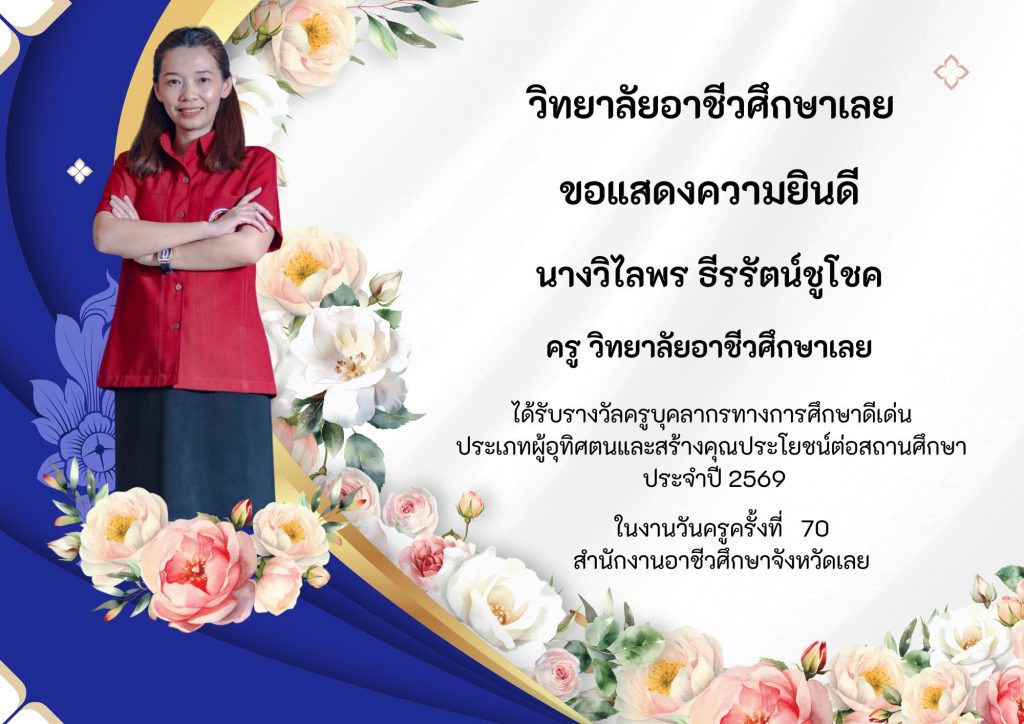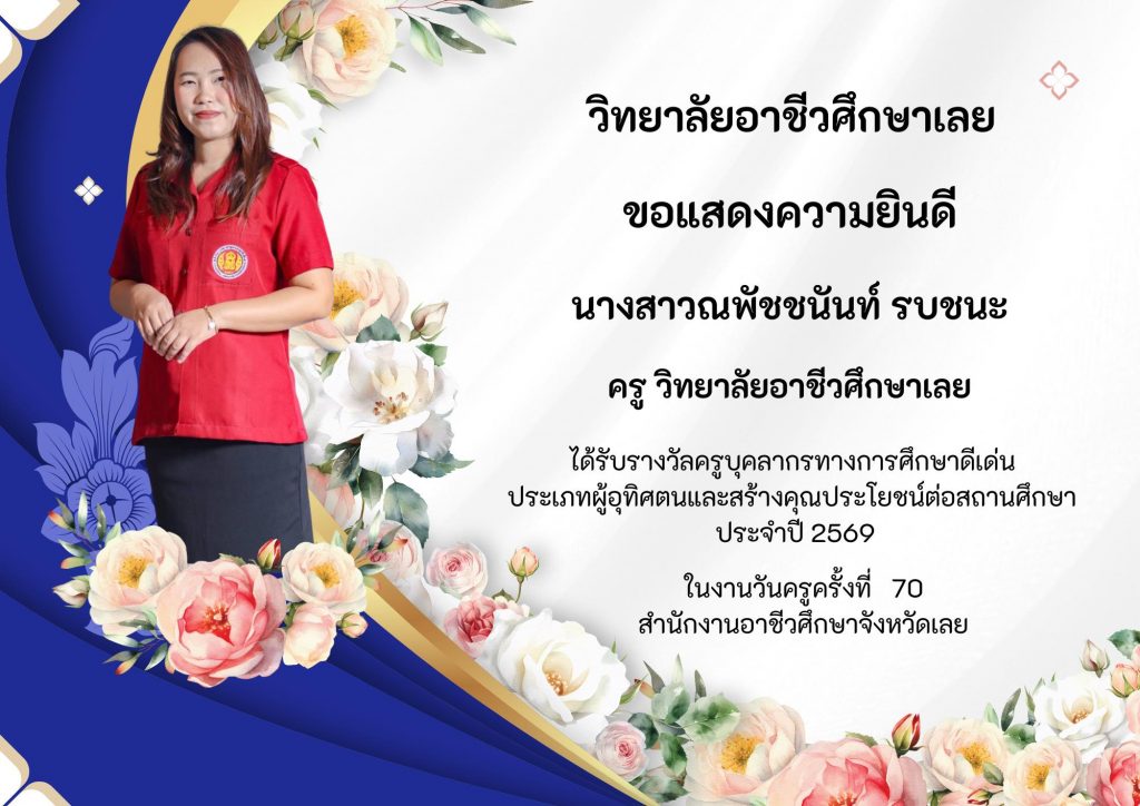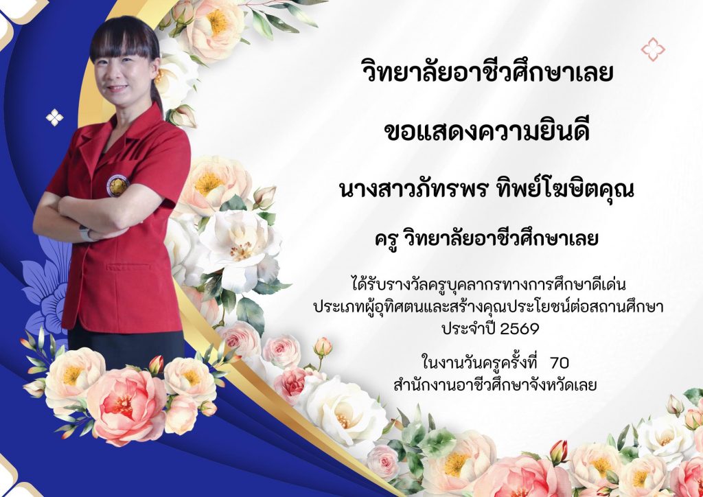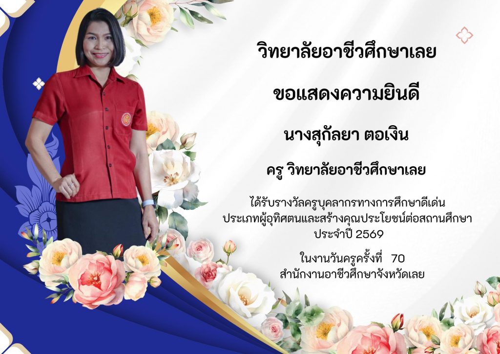 วิทยาลัยอาชีวศึกษาเลยขอแสดงความยินดีกับครูและบุคลากรที่ได้รับรางวัล ประเภทผู้อุทิศตนและสร้างคุณประโยชน์ต่อสถานศึกษา ประจำปี 2569 ในงานวันครูครั้งที่ 70 สำนักงานอาชีวศึกษาจังหวัดเลย