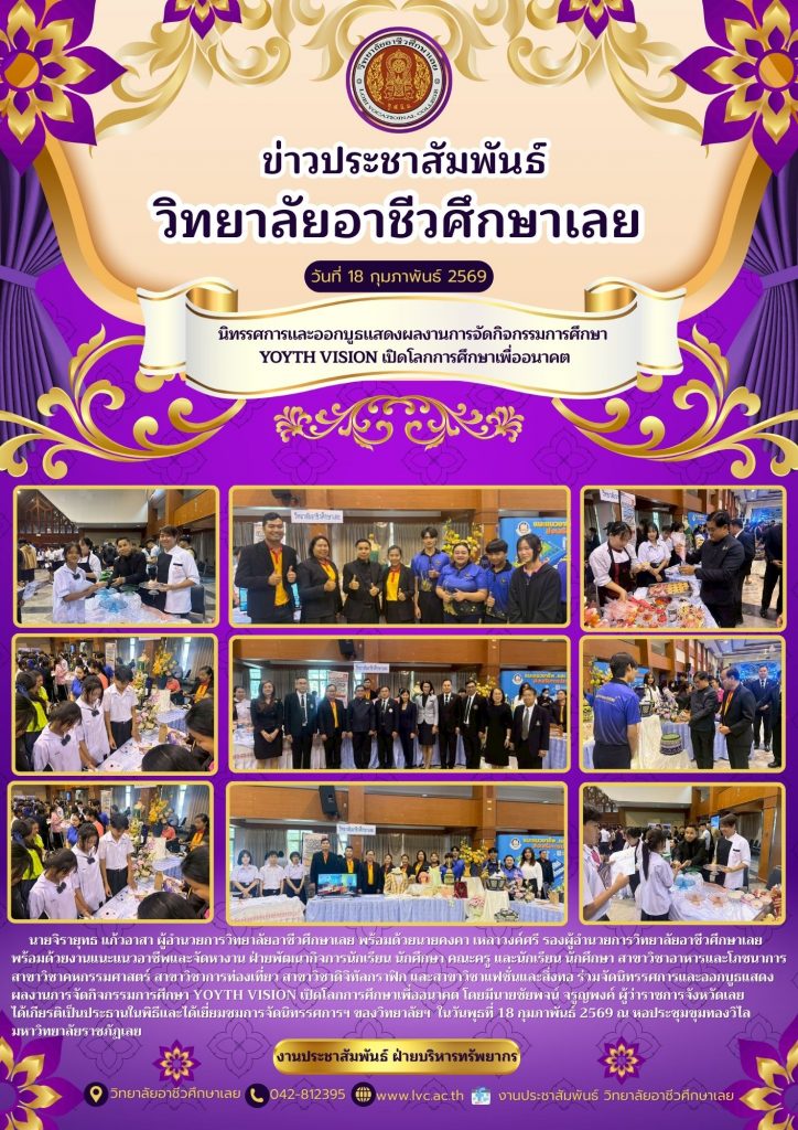 นายจิรายุทธ แก้วอาสา ผู้อำนวยการวิทยาลัยอาชีวศึกษาเลย พร้อมด้วยนายคงคา เหลาวงค์ศรี รองผู้อำนวยการวิทยาลัยอาชีวศึกษาเลย พร้อมด้วยงานแนะแนวอาชีพและจัดหางาน ฝ่ายพัฒนากิจการนักเรียน นักศึกษา คณะครู และนักเรียน นักศึกษา สาขาวิชาอาหารและโภชนาการ สาขาวิชาคหกรรมศาสตร์ สาขาวิชาการท่องเที่ยว สาขาวิชาดิจิทัลกราฟิก และสาขาวิชาแฟชั่นและสิ่งทอ ร่วมจัดนิทรรศการและออกบูธแสดง ผลงานการจัดกิจกรรมการศึกษา Yoyth vision เปิดโลกการศึกษาเพื่ออนาคต โดยมีนายชัยพจน์ จรูญพงค์ ผู้ว่าราชการจังหวัดเลย ได้เกียรติเป็นประธานในพิธีและได้เยี่ยมชมการจัดนิทรรศการฯ ของวิทยาลัยฯ ในวันพุธที่ 18 กุมภาพันธ์ 2569 ณ หอประชุมขุมทองวิไล มหาวิทยาลัยราชภัฏเลย