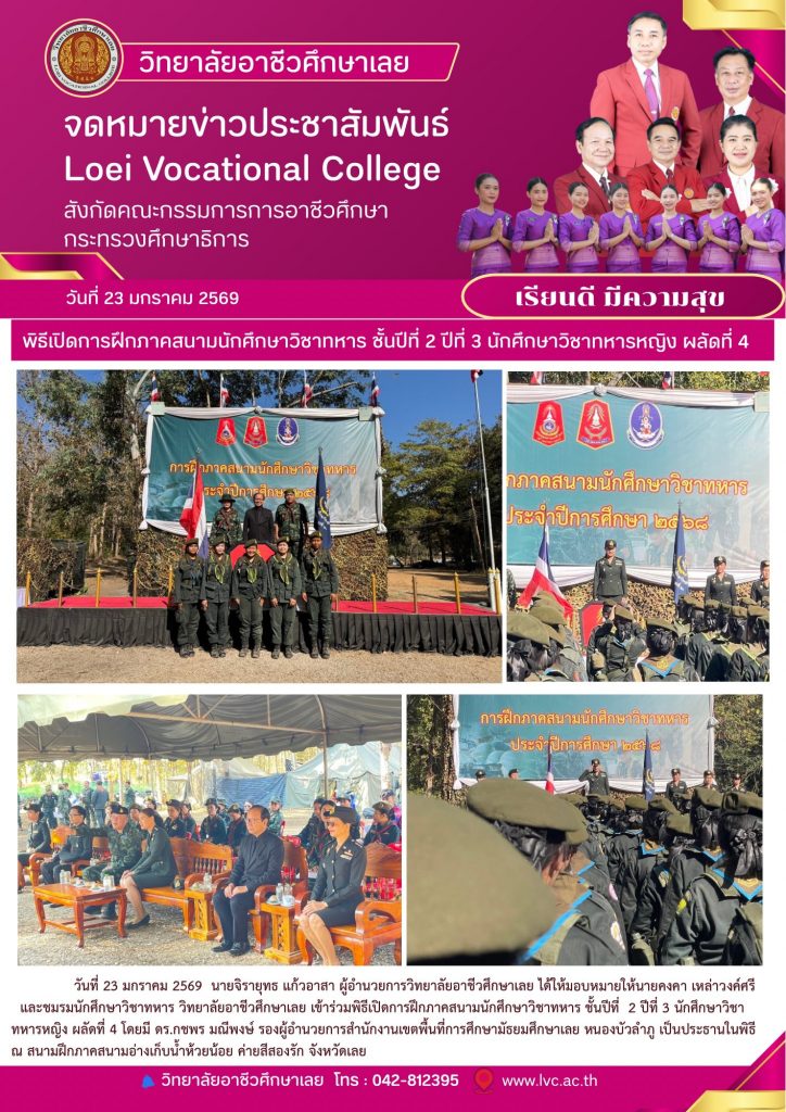 วันที่ 23 มกราคม 2569 นายจิรายุทธ แก้วอาสา ผู้อำนวยการวิทยาลัยอาชีวศึกษาเลย ได้ให้มอบหมายให้นายคงคา เหล่าวงค์ศรีรองผู้อำนวยการวิทยาลัยอาชีวศึกษาเลย และชมรมนักศึกษาวิชาทหาร วิทยาลัยอาชีวศึกษาเลย เข้าร่วมพิธีเปิดการฝึกภาคสนามนักศึกษาวิชาทหาร ชั้นปีที่ 2 ปีที่ 3 นักศึกษาวิชาทหารหญิง ผลัดที่ 4 โดยมี ดร.กชพร มณีพงษ์ รองผู้อำนวยการสำนักงานเขตพื้นที่การศึกษามัธยมศึกษาเลย หนองบัวลำภู เป็นประธานในพิธี ณ สนามฝึกภาคสนามอ่างเก็บน้ำห้วยน้อย ค่ายสีสองรัก จังหวัดเลย