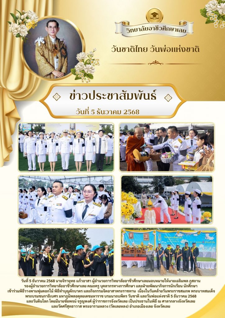 วันที่ 5 ธันวาคม 2568 นายจิรายุทธ แก้วอาสา ผู้อำนวยการวิทยาลัยอาชีวศึกษาเลยมอบหมายให้นายเฉลิมพล ภูสถาน รองผู้อำนวยการวิทยาลัยอาชีวศึกษาเลย คณะครู บุคลากรทางการศึกษา และฝ่ายพัฒนากิจการนักเรียน นักศึกษา เข้าร่วมพิธีวางพานพุ่มดอกไม้ พิธีทำบุญตักบาตร และกิจกรรมจิตอาสาพระราชทาน เนื่องในวันคล้ายวันพระราชสมภพ พระบาทสมเด็จพระบรมชนกาธิเบศร มหาภูมิพลอดุลยเดชมหาราช บรมนาถบพิตร วันชาติ และวันพ่อแห่งชาติ 5 ธันวาคม 2568 และวันดินโลก โดยมีนายชัยพจน์ จรูญพงศ์ ผู้ว่าราชการจังหวัดเลย เป็นประธานในพิธี ณ ศาลากลางจังหวัดเลย และวัดศรีสุทธาวาส พระอารามหลวง (วัดเลยหลง) อำเภอเมืองเลย จังหวัดเลย
