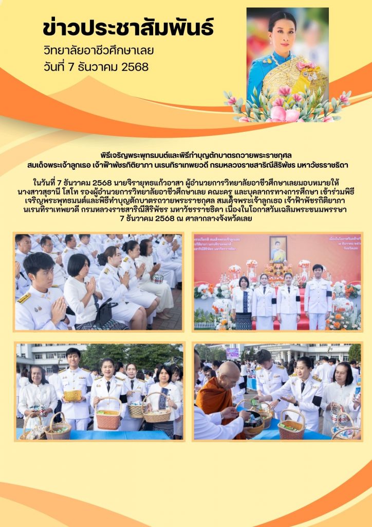 ในวันที่ 7 ธันวาคม 2568 นายจิรายุทธแก้วอาสา ผู้อำนวยการวิทยาลัยอาชีวศึกษาเลยมอบหมายให้นางสาวสุธานี โสโท รองผู้อำนวยการวิทยาลัยอาชีวศึกษาเลย คณะครู และบุคลากรทางการศึกษา เข้าร่วมพิธีเจริญพระพุทธมนต์และพิธีทำบุญตักบาตรถวายพระราชกุศล สมเด็จพระเจ้าลูกเธอ เจ้าฟ้าพัชรกิติยาภา นเรนทิราเทพยวดี กรมหลวงราชสาริณีสิริพัชร มหาวัชรราชธิดา เนื่องในโอกาสวันเฉลิมพระชนมพรรษา 7 ธันวาคม 2568 ณ ศาลากลางจังหวัดเลย
