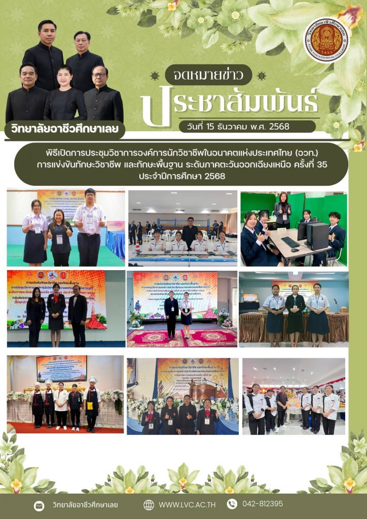 ในระหว่างวันที่ 15-19 ธันวาคม 2568 นายจิรายุทธ แก้วอาสา ผู้อำนวยการวิทยาลัยอาชีวศึกษาเลย พร้อมด้วยคณะผู้บริหาร คณะครู และนักเรียน นักศึกษา เข้าร่วมพิธีเปิดการประชุมวิชาการองค์การนักวิชาชีพ ในอนาคตแห่งประเทศไทย (อวท.) การแข่งขันทักษะวิชาชีพ และทักษะพื้นฐาน ระดับภาคตะวันออกเฉียงเหนือ ครั้งที่ 35 ประจำปีการศึกษา 2568 โดยได้รับเกียรติจาก นายวิทวัต ปัญจมะวัต รองเลขาธิการคณะกรรมการ การอาชีวศึกษา เป็นประธานในพิธีเปิด ณ สวนสาธารณะกุดน้ำกิน อำเภอเมืองกาฬสินธุ์ จังหวัดกาฬสินธุ์