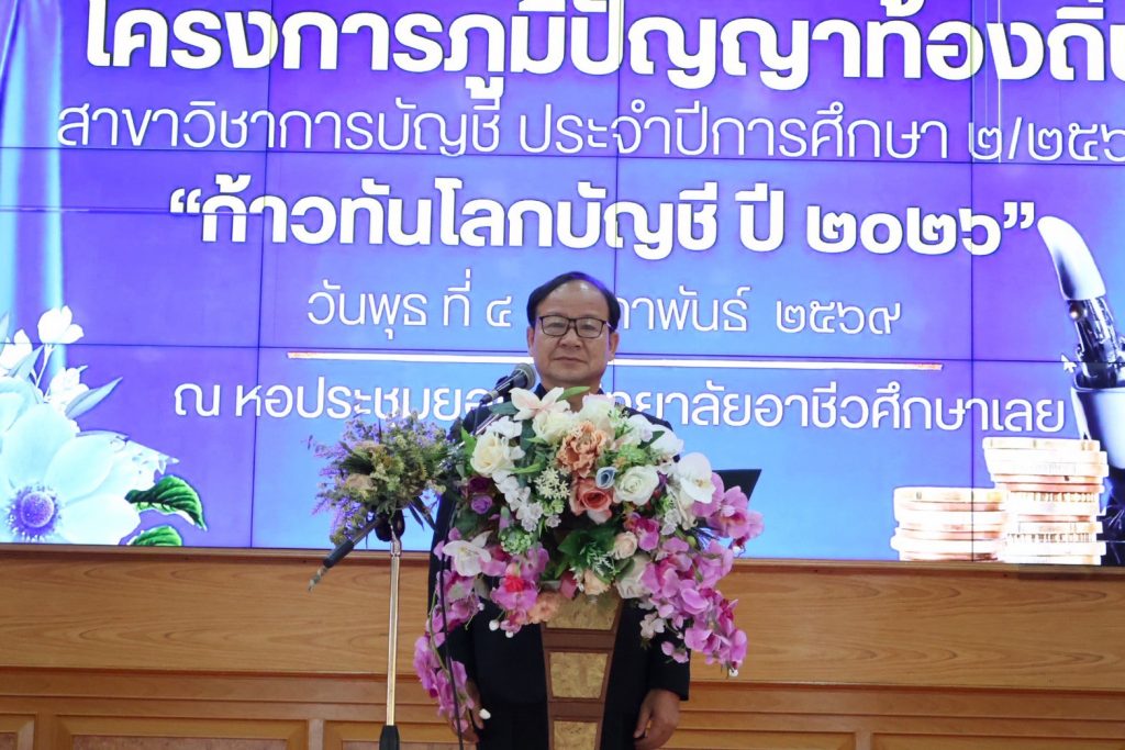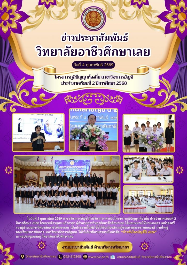 ในวันที่ 4 กุมภาพันธ์ 2569 สาขาวิชาการบัญชี ฝ่ายวิชาการ ดำเนินโครงการภูมิปัญญาท้องถิ่น ประจำภาคเรียนที่ 2ปีการศึกษา 2568 โดยนายจิรายุทธ แก้วอาสา ผู้อำนวยการวิทยาลัยอาชีวศึกษาเลย ได้มอบหมายให้นายงคงคา เหล่าคงศรีรองผู้อำนวยการวิทยาลัยอาชีวศึกษาเลย เป็นประธานในพิธี ซึ่งได้รับเกียรติจากผู้ช่วยศาสตราจารย์เหมวดี กายใหญ่ คณะวิทยาการจัดการ มหาวิทยาลัยราชภัฏเลย ได้ให้เกียรติมาบรรยายในหัวข้อ “ก้าวทันโลกบัญชีปี 2026” ณ หอประชุมยอดภู วิทยาลัยอาชีวศึกษาเลย