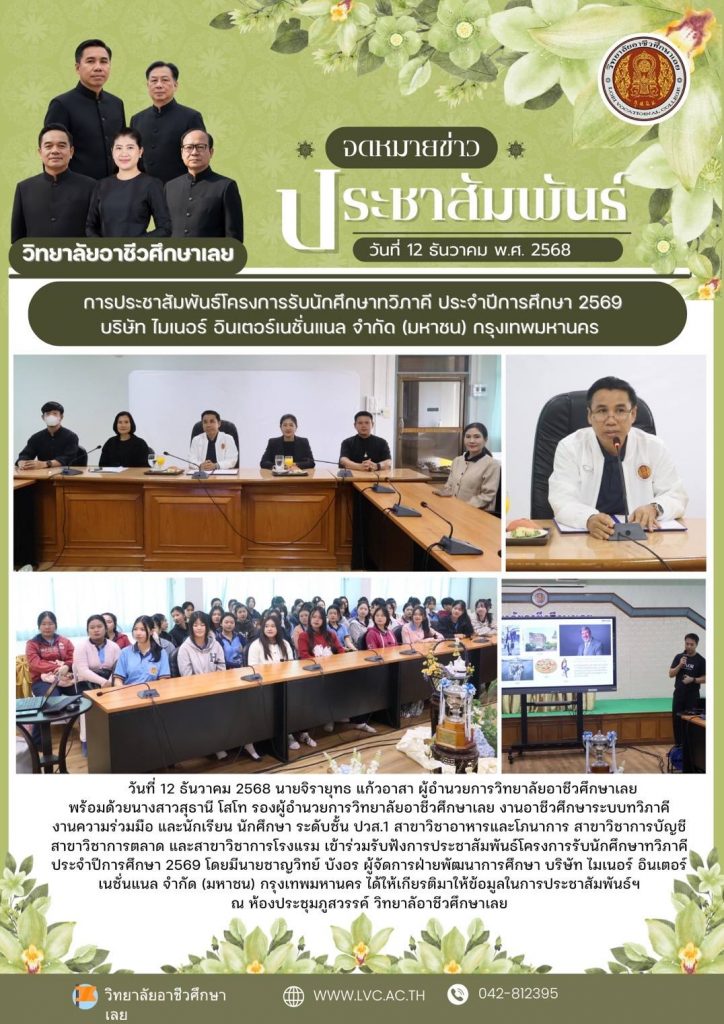 วันที่ 12 ธันวาคม 2568 นายจิรายุทธ แก้วอาสา ผู้อำนวยการวิทยาลัยอาชีวศึกษาเลย พร้อมด้วยนางสาวสุธานี โสโท รองผู้อำนวยการวิทยาลัยอาชีวศึกษาเลย งานอาชีวศึกษาระบบทวิภาคี งานความร่วมมือ และนักเรียน นักศึกษา ระดับชั้น ปวส.1 สาขาวิชาอาหารและโภนาการ สาขาวิชาการบัญชี สาขาวิชาการตลาด และสาขาวิชาการโรงแรม เข้าร่วมรับฟังการประชาสัมพันธ์โครงการรับนักศึกษาทวิภาคี ประจำปีการศึกษา 2569 โดยมีนายชาญวิทย์ บังอร ผู้จัดการฝ่ายพัฒนาการศึกษา บริษัท ไมเนอร์ อินเตอร์เนชั่นแนล จำกัด (มหาชน) กรุงเทพมหานคร ได้ให้เกียรติมาให้ข้อมูลในการประชาสัมพันธ์ฯ ณ ห้องประชุมภูสวรรค์ วิทยาลัอาชีวศึกษาเลย