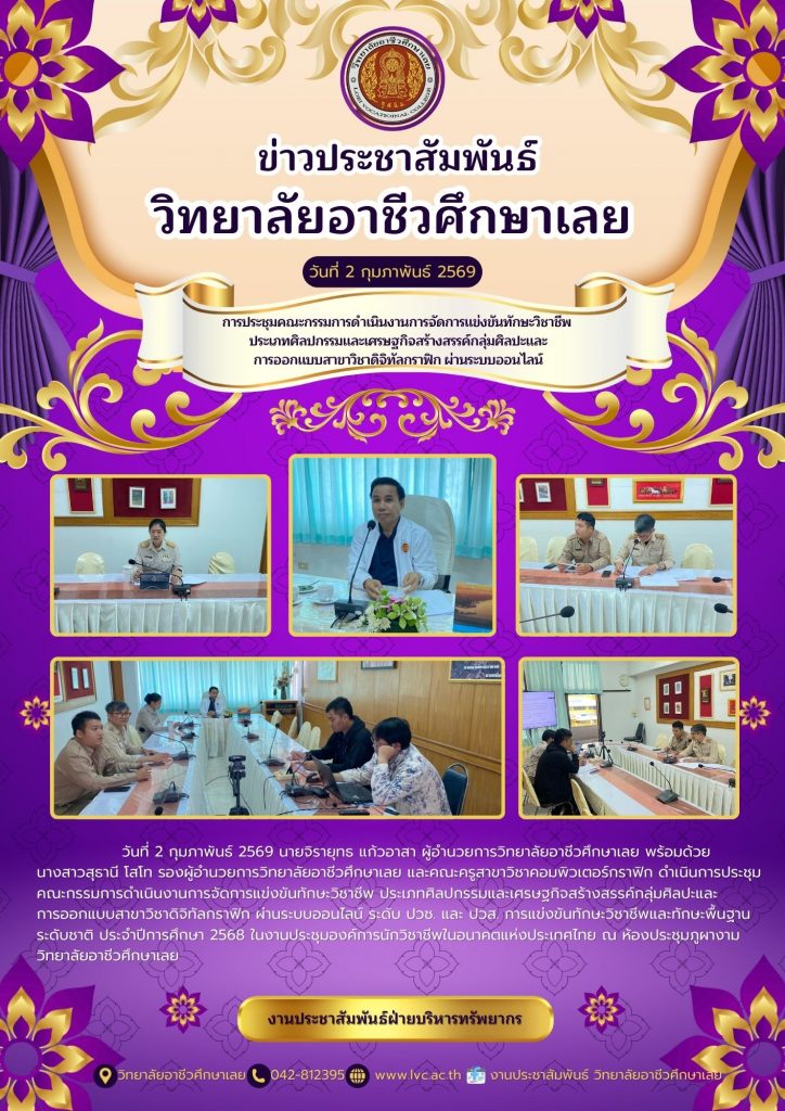 วันที่ 2 กุมภาพันธ์ 2569 นายจิรายุทธ แก้วอาสา ผู้อำนวยการวิทยาลัยอาชีวศึกษาเลย พร้อมด้วยนางสาวสุธานี โสโท รองผู้อำนวยการวิทยาลัยอาชีวศึกษาเลย และคณะครูสาขาวิชาคอมพิวเตอร์กราฟิก ดำเนินการประชุมคณะกรรมการดำเนินงานการจัดการแข่งขันทักษะวิชาชีพ ประเภทศิลปกรรมและเศรษฐกิจสร้างสรรค์กลุ่มศิลปะและการออกแบบสาขาวิชาดิจิทัลกราฟิก ผ่านระบบออนไลน์ ระดับ ปวช. และ ปวส. การแข่งขันทักษะวิชาชีพและทักษะพื้นฐาน ระดับชาติ ประจำปีการศึกษา 2568 ในงานประชุมองค์การนักวิชาชีพในอนาคตแห่งประเทศไทย ณ ห้องประชุมภูผางาม วิทยาลัยอาชีวศึกษาเลย