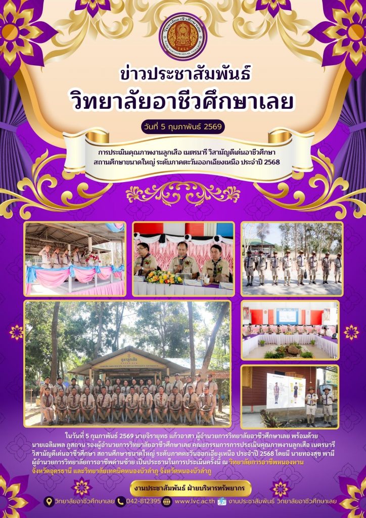 ในวันที่ 5 กุมภาพันธ์ 2569 นายจิรายุทธ แก้วอาสา ผู้อำนวยการวิทยาลัยอาชีวศึกษาเลย พร้อมด้วยนายเฉลิมพล ภูสถาน รองผู้อำนวยการวิทยาลัยอาชีวศึกษาเลย คณะกรรมการการประเมินคุณภาพงานลูกเสือ เนตรนารี วิสามัญดีเด่นอาชีวศึกษา สถานศึกษาขนาดใหญ่ ระดับภาคตะวันออกเฉียงเหนือ ประจำปี 2568 โดยมี นายทองสุข พามี ผู้อำนวยการวิทยาลัยการอาชีพด่านซ้าย เป็นประธานในการประเมินครั้งนี้ ณ วิทยาลัยการอาชีพหนองหาน จังหวัดอุดรธานี และวิทยาลัยเทคนิคหนองบัวลำภู จังหวัดหนองบัวลำภู