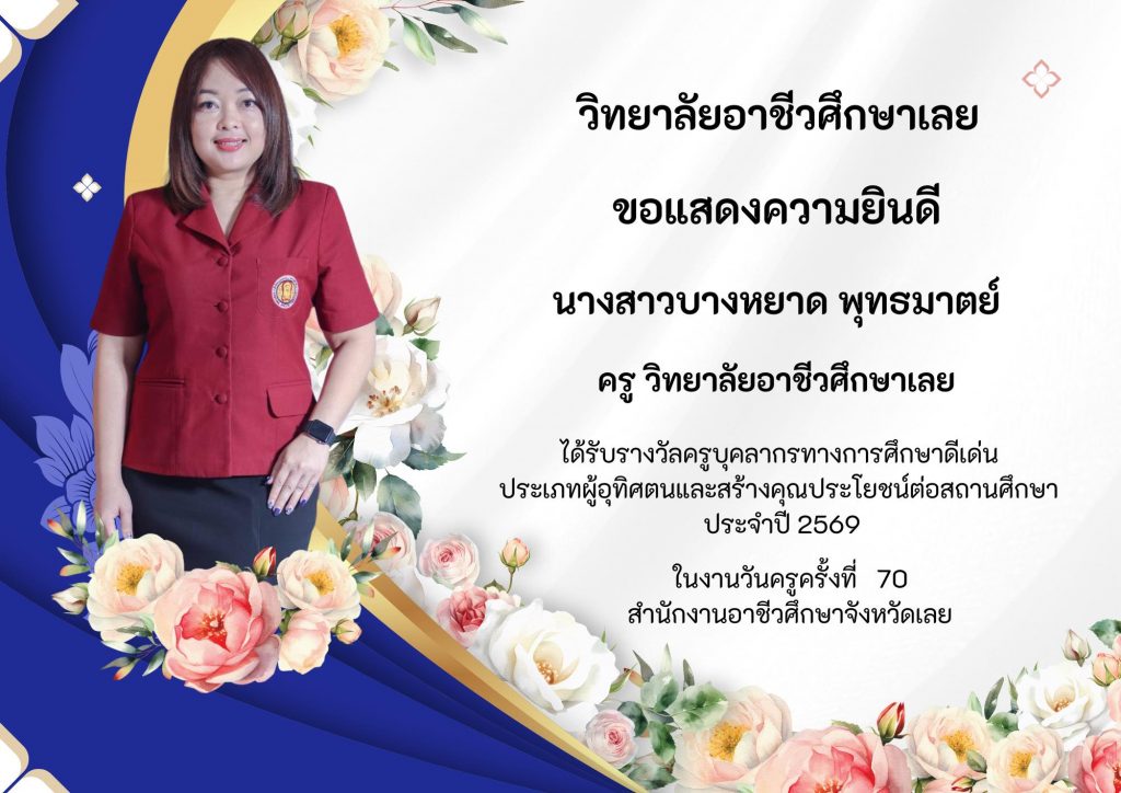 วิทยาลัยอาชีวศึกษาเลยขอแสดงความยินดีกับครูและบุคลากรที่ได้รับรางวัล ประเภทผู้อุทิศตนและสร้างคุณประโยชน์ต่อสถานศึกษา ประจำปี 2569 ในงานวันครูครั้งที่ 70 สำนักงานอาชีวศึกษาจังหวัดเลย