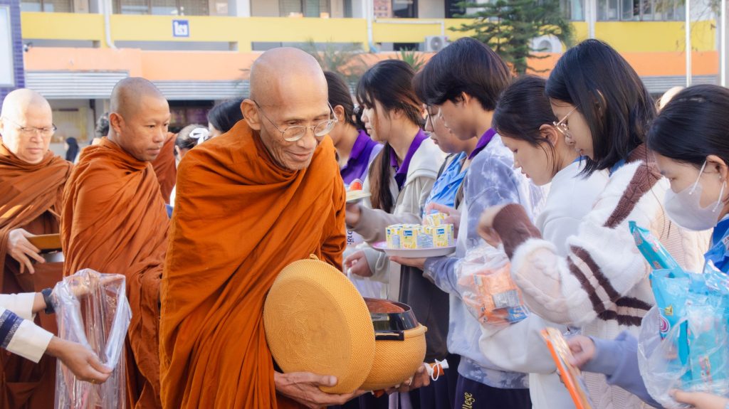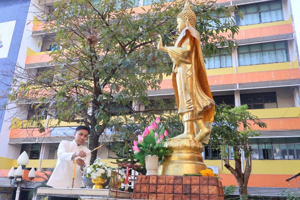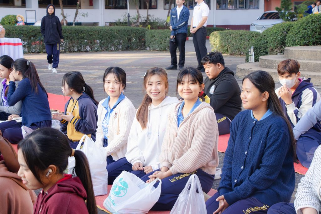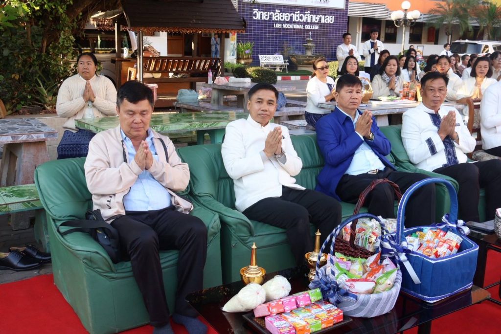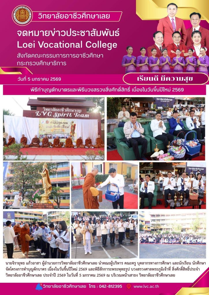 นายจิรายุทธ แก้วอาสา ผู้อำนวยการวิทยาลัยอาชีวศึกษาเลย นำคณะผู้บริหาร คณะครู บุคลากรทางการศึกษา และนักเรียน นักศึกษา จัดโครงการทำบุญตักบาตร เนื่องในวันขึ้นปีใหม่ 2569 และพิธีสักการะพระพุทธรูป บวงสรวงศาลพระภูมิเจ้าที่ สิ่งศักดิ์สิทธิ์ประจำวิทยาลัยอาชีวศึกษาเลย ประจำปี 2569 ในวันที่ 5 มกราคม 2569 ณ บริเวณหน้าเสาธง วิทยาลัยอาชีวศึกษาเลย