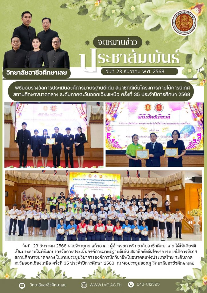 วันที่ 23 ธันวาคม 2568 นายจิรายุทธ แก้วอาสา ผู้อำนวยการวิทยาลัยอาชีวศึกษาเลย ได้ให้เกียรติ เป็นประธานในพิธีมอบรางวัลการประเมินองค์การมาตรฐานดีเด่น สมาชิกดีเด่นโครงการภายใต้การนิเทศ สถานศึกษาขนาดกลาง ในงานประชุมวิชาการองค์การนักวิชาชีพในอนาคตแห่งประเทศไทย ระดับภาค ตะวันออกเฉียงเหนือ ครั้งที่ 35 ประจำปีการศึกษา 2568 ณ หอประชุมยอดภู วิทยาลัยอาชีวศึกษาเลย