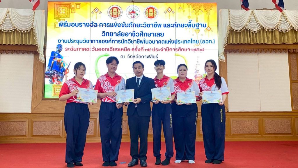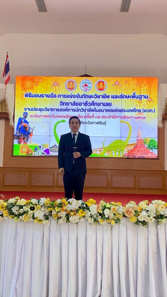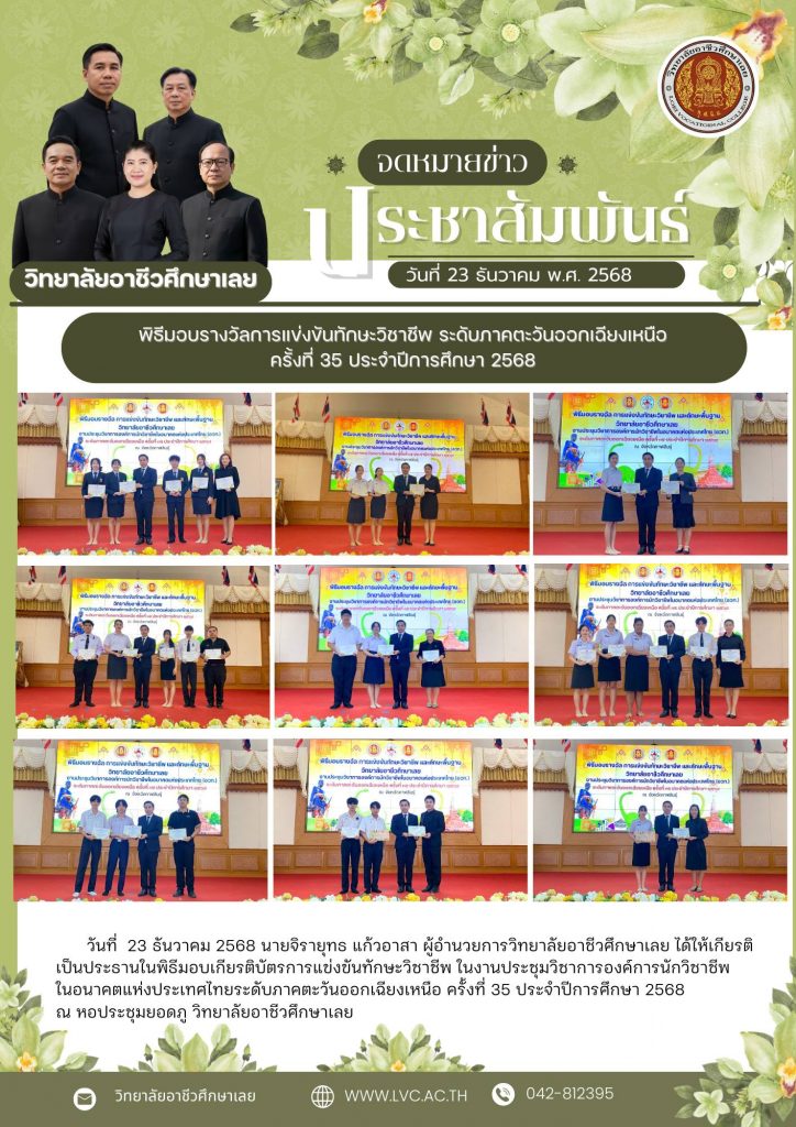 วันที่ 23 ธันวาคม 2568 นายจิรายุทธ แก้วอาสา ผู้อำนวยการวิทยาลัยอาชีวศึกษาเลย ได้ให้เกียรติ เป็นประธานในพิธีมอบเกียรติบัตรการแข่งขันทักษะวิชาชีพ ในงานประชุมวิชาการองค์การนักวิชาชีพ ในอนาคตแห่งประเทศไทยระดับภาคตะวันออกเฉียงเหนือ ครั้งที่ 35 ประจำปีการศึกษา 2568 ณ หอประชุมยอดภู วิทยาลัยอาชีวศึกษาเลย