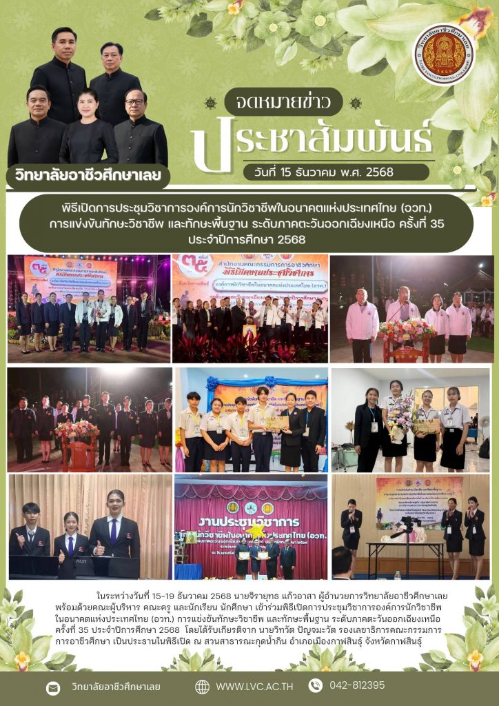 ในระหว่างวันที่ 15-19 ธันวาคม 2568 นายจิรายุทธ แก้วอาสา ผู้อำนวยการวิทยาลัยอาชีวศึกษาเลย พร้อมด้วยคณะผู้บริหาร คณะครู และนักเรียน นักศึกษา เข้าร่วมพิธีเปิดการประชุมวิชาการองค์การนักวิชาชีพ ในอนาคตแห่งประเทศไทย (อวท.) การแข่งขันทักษะวิชาชีพ และทักษะพื้นฐาน ระดับภาคตะวันออกเฉียงเหนือ ครั้งที่ 35 ประจำปีการศึกษา 2568 โดยได้รับเกียรติจาก นายวิทวัต ปัญจมะวัต รองเลขาธิการคณะกรรมการ การอาชีวศึกษา เป็นประธานในพิธีเปิด ณ สวนสาธารณะกุดน้ำกิน อำเภอเมืองกาฬสินธุ์ จังหวัดกาฬสินธุ์