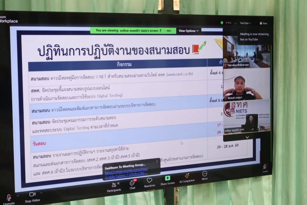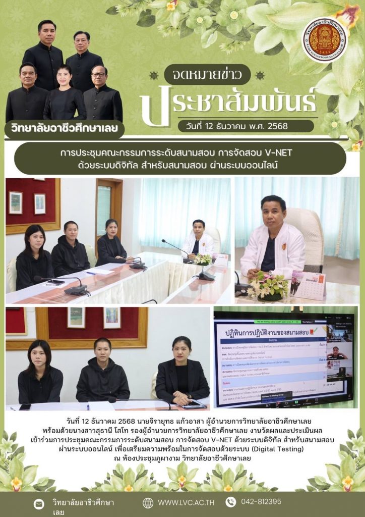 วันที่ 12 ธันวาคม 2568 นายจิรายุทธ แก้วอาสา ผู้อำนวยการวิทยาลัยอาชีวศึกษาเลย พร้อมด้วยนางสาวสุธานี โสโท รองผู้อำนวยการวิทยาลัยอาชีวศึกษาเลย งานวัดผลและประเมินผล เข้าร่วมการประชุมคณะกรรมการระดับสนามสอบ การจัดสอบ V-NET ด้วยระบบดิจิทัล สำหรับสนามสอบ ผ่านระบบออนไลน์ เพื่อเตรียมความพร้อมในการจัดสอบด้วยระบบ (Digital Testing) ณ ห้องประชุมภูผางาม วิทยาลัยอาชีวศึกษาเลย