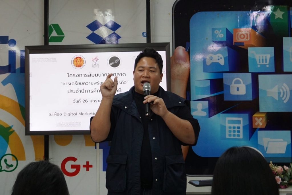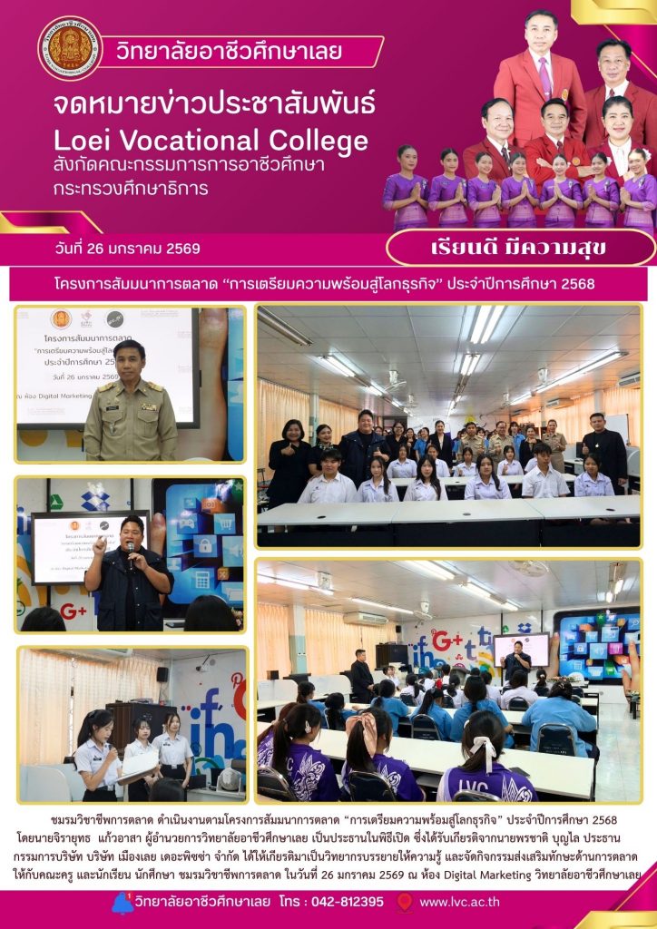 ชมรมวิชาชีพการตลาด ดำเนินงานตามโครงการสัมมนาการตลาด “การเตรียมความพร้อมสู่โลกธุรกิจ” ประจำปีการศึกษา 2568 โดยนายจิรายุทธ แก้วอาสา ผู้อำนวยการวิทยาลัยอาชีวศึกษาเลย เป็นประธานในพิธีเปิด ซึ่งได้รับเกียรติจากนายพรชาติ บุญไล ประธานกรรมการบริษัท บริษัท เมืองเลย เดอะพิซซ่า จำกัด ได้ให้เกียรติมาเป็นวิทยากรบรรยายให้ความรู้ และจัดกิจกรรมส่งเสริมทักษะด้านการตลาดให้กับคณะครู และนักเรียน นักศึกษา ชมรมวิชาชีพการตลาด ในวันที่ 26 มกราคม 2569 ณ ห้อง Digital Marketing วิทยาลัยอาชีวศึกษาเลย